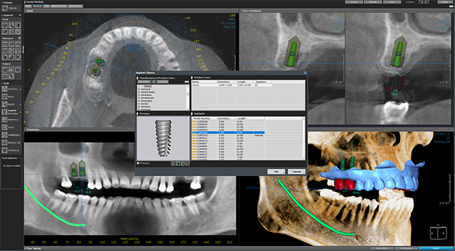 Our Dental module has all of the handy tools used for diagnosis and treatment planning including implant planning with real-size implant fixtures from major manufacturers complete with virtual teeth and every view format needed by dentists such as TMJ, bilateral TMJ, panoramic, and cross sectional views. Dental module also features 3D volume rendering, implant verification and MIP rendering functions.